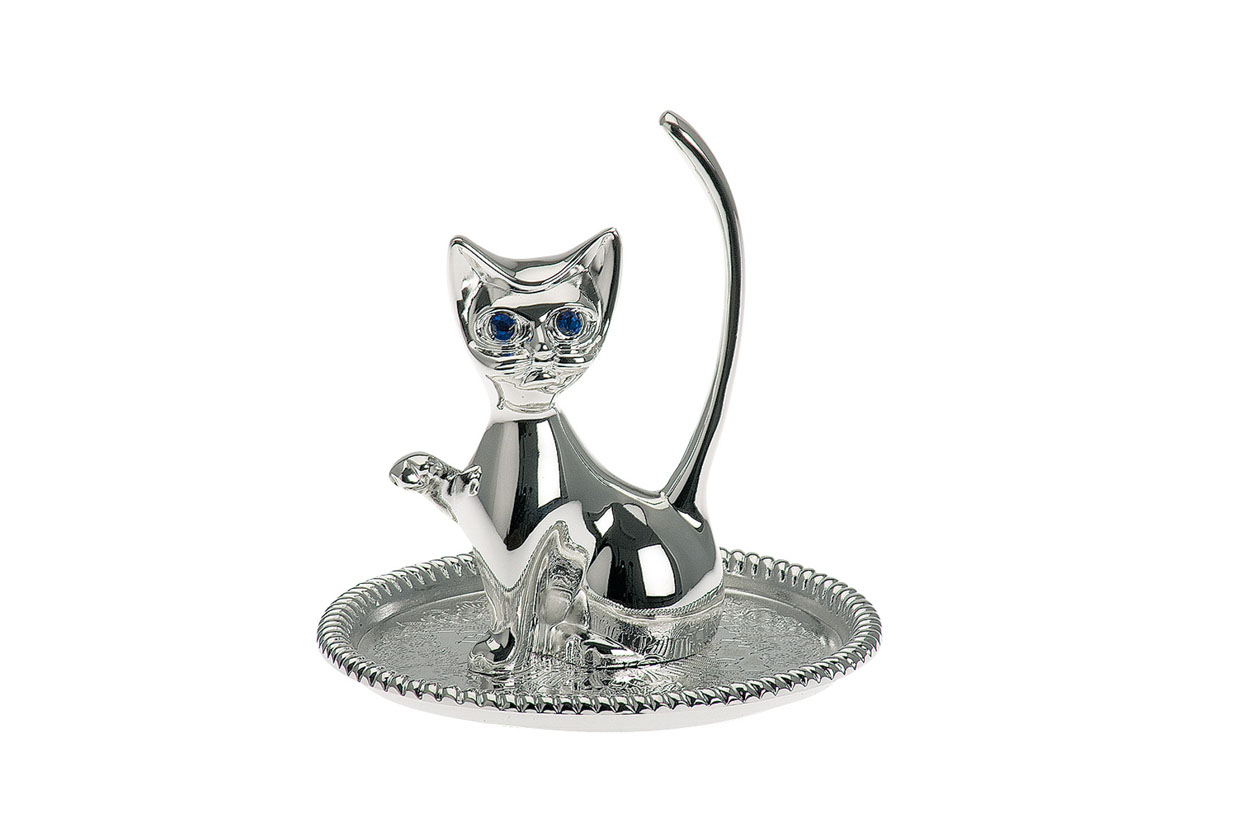 Die detailreiche Figur mit funkelnden, blauen Glaskristallen als Augen steht auf einem fein verzierten Tablett und dem geschwungene Katzenschwanz eignet sich perfekt zum Aufstecken Deiner Lieblingsringe.