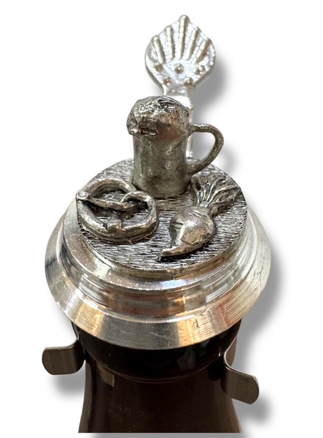 Dieser hochwertige Zinndeckel für Bierflaschen überzeugt durch sein einzigartiges bayerisches Brotzeit-Motiv.