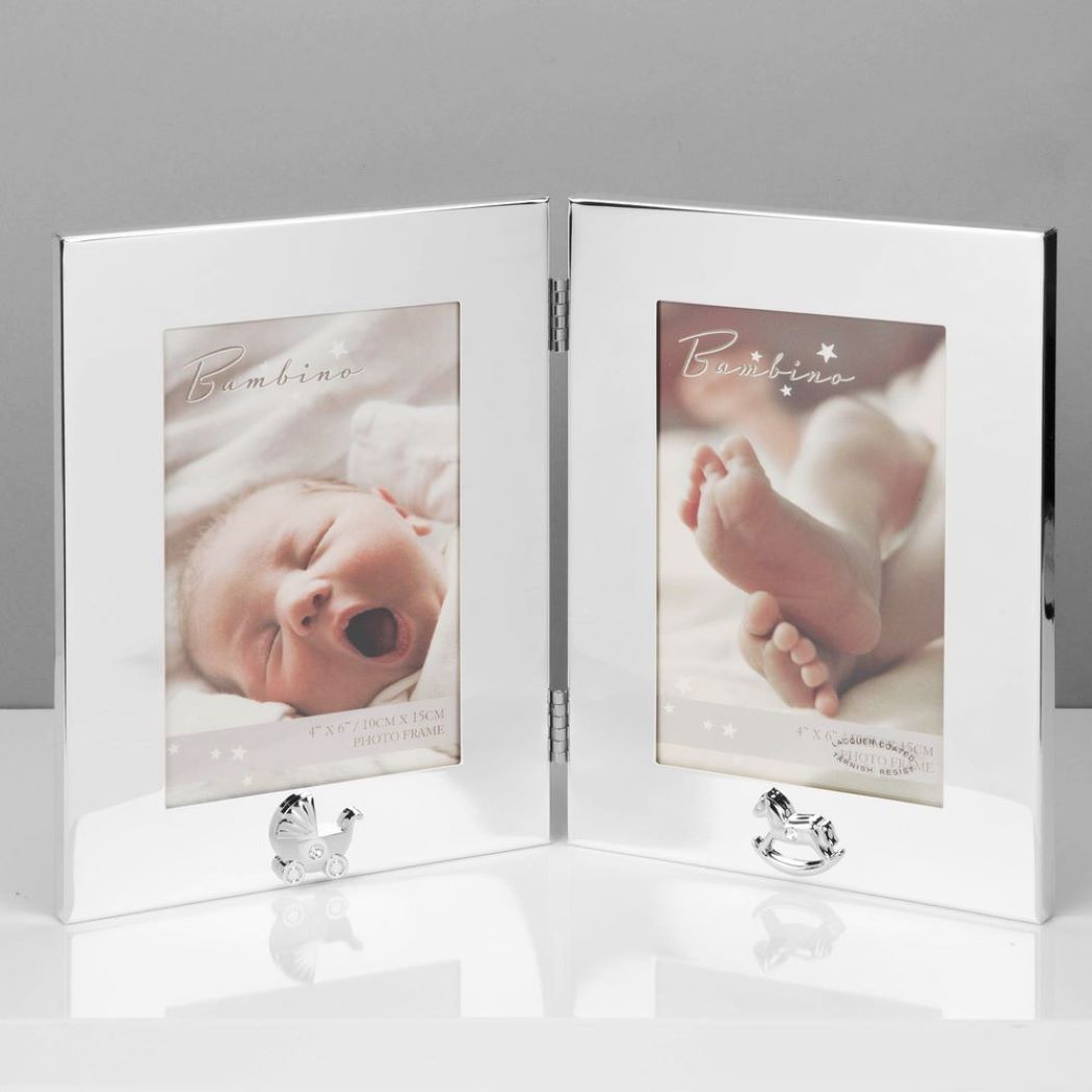 Der versilberte Doppelbilderrahmen mit Kinderwagen & Schaukelpferd - Fotorahmen für Kinder