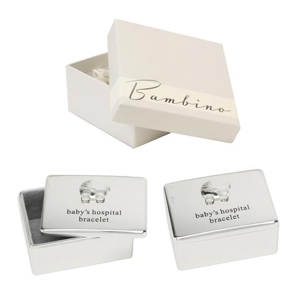 Die versilberte Dose ist ein liebevolles Erinnerungsstück zur Aufbewahrung des Geburtsarmbands („Baby’s Hospital Bracelet“).