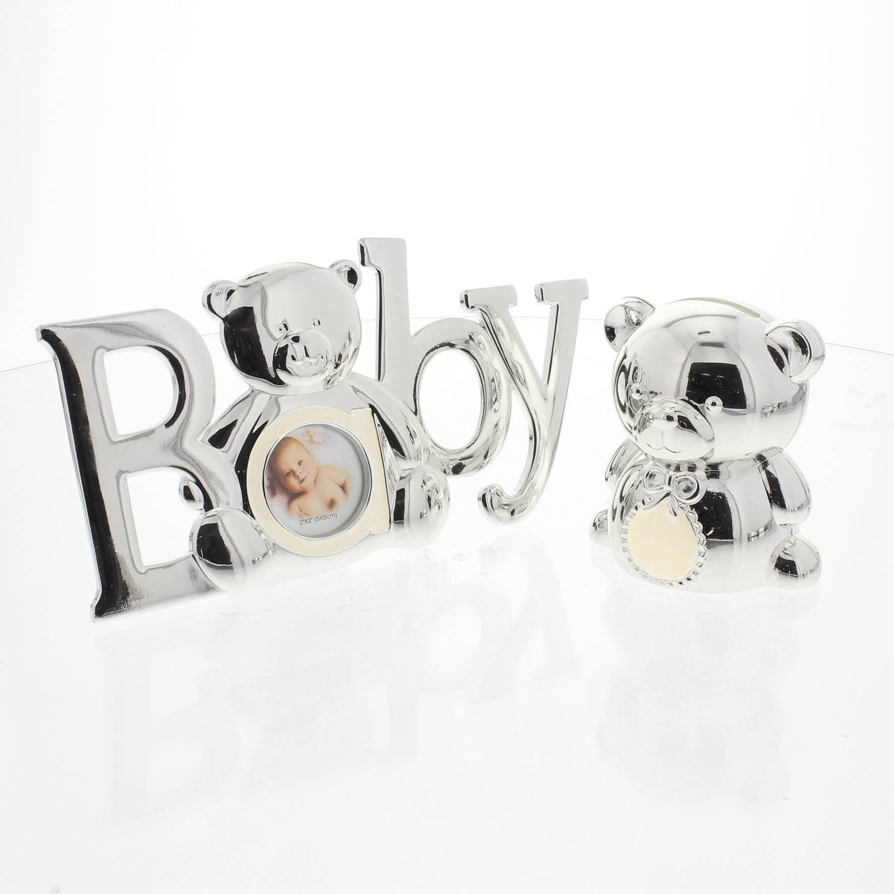 Das versilberte Geschenkset - Bilderrahmen und Spardose Teddy