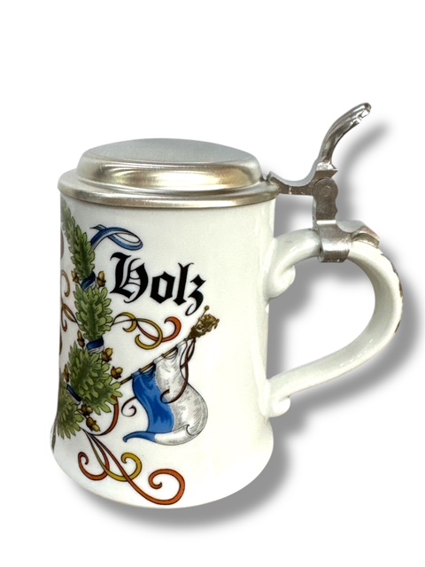 Bierkrug für Kegler mit Zinndeckel, Porzellankrug Gut Holz - Gravurfähig
