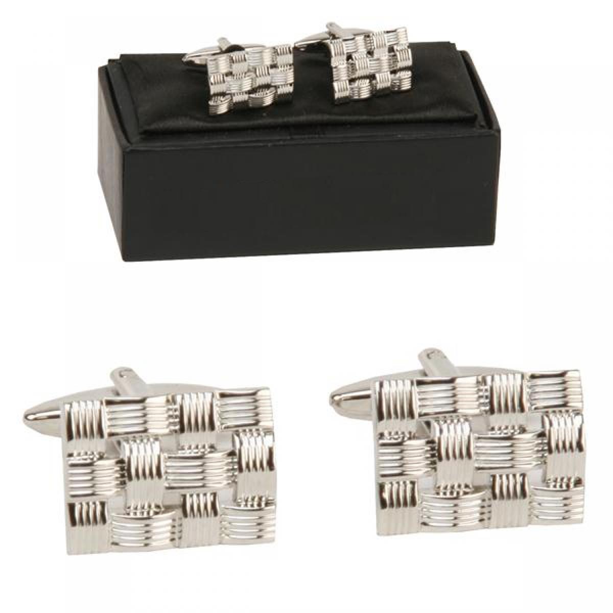 Die schönen silberenen Manschettenknöpfe in Silber mit Webeeffekt. Zeitlos und elegant ist dieses Unisex Accessoire. Die Rechtecke sind in einem gewebten Effekt dargestellt, und passen hervorragend zu sportlicher oder eleganter Kleidung.. Sie sind komplett Rhodiniert und somit anlaufgeschützt und unempfindlich gegen Kratzer Maße: ca. 2 x 1,5 cm