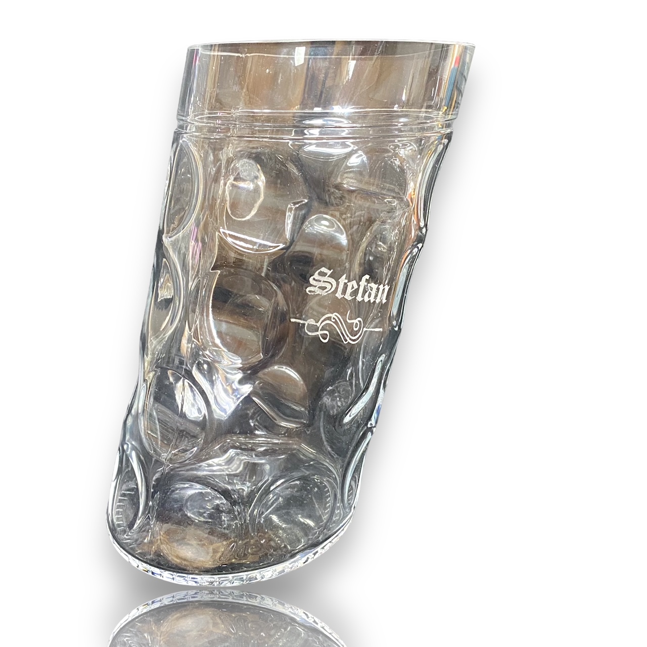 Auf Wunsch gravieren wir einen Namen oder kurzen Wunschtext (bis zu 12 Zeichen) auf die Stirnseite des Glaskruges – eine persönliche Geschenkidee für jeden Anlass!